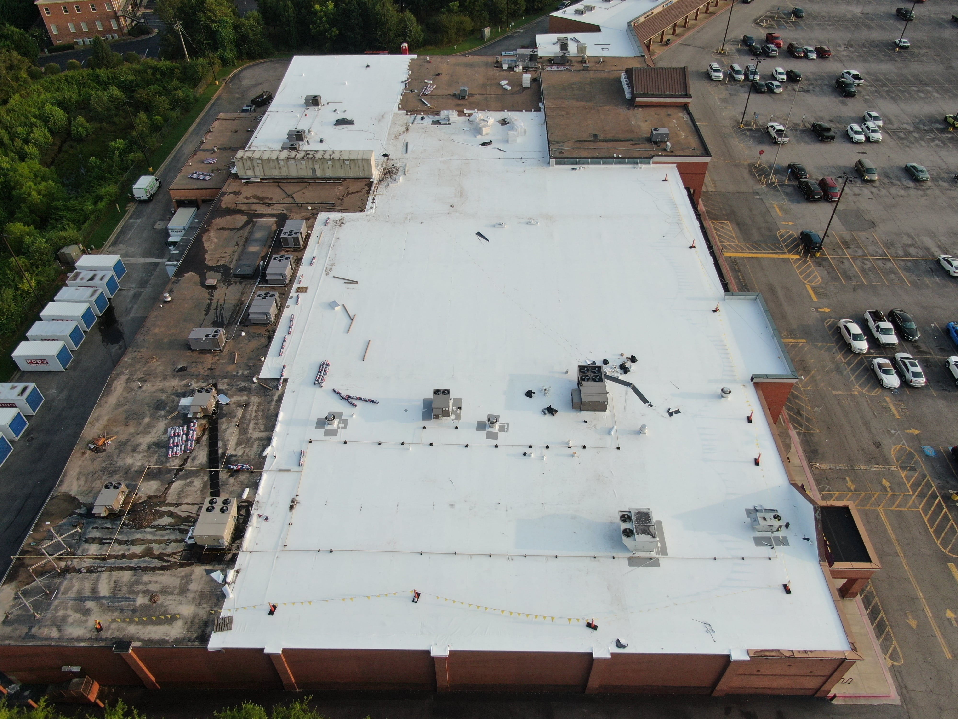 Aerial progress photos show the scale of the operation — from raw steel decking to fully wrapped white membrane systems providing a clean, factory-grade exterior finish.