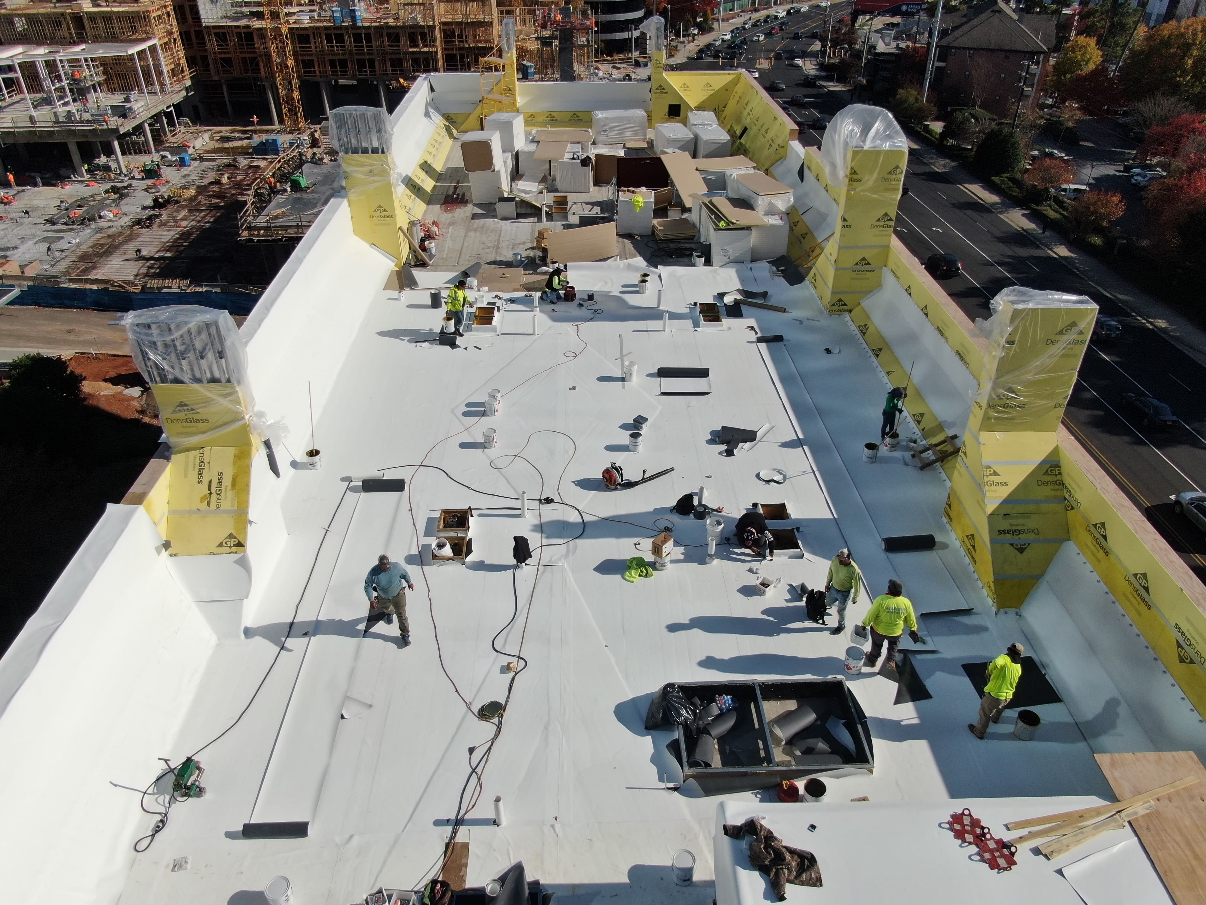 The white TPO membrane provides exceptional heat reflectivity—an important feature given Atlanta’s dense, heat-retaining urban environment—while also maintaining a sleek, uniform aesthetic across the rooftop.